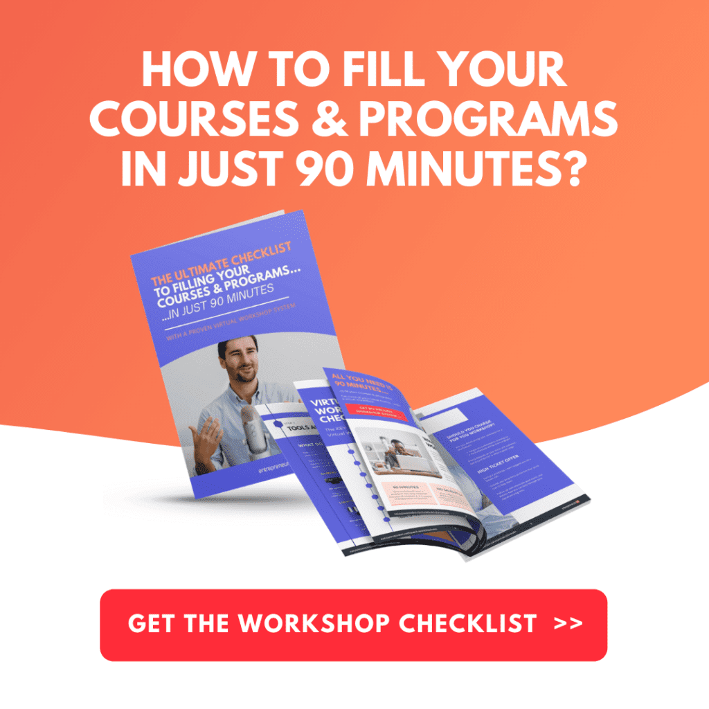 Unfortunately, the well-known saying, “If you build it, they will come”, isn’t always true—particularly when it comes to online courses. But one strategy you may want to employ to help guide your audience to your offering is through workshops. Fortunately, Liam Austin of Entrepreneurs HQ created this downloadable PDF checklist that includes 7 key steps to launching a virtual workshop that fills your courses and programs, in just 90 minutes. It includes: