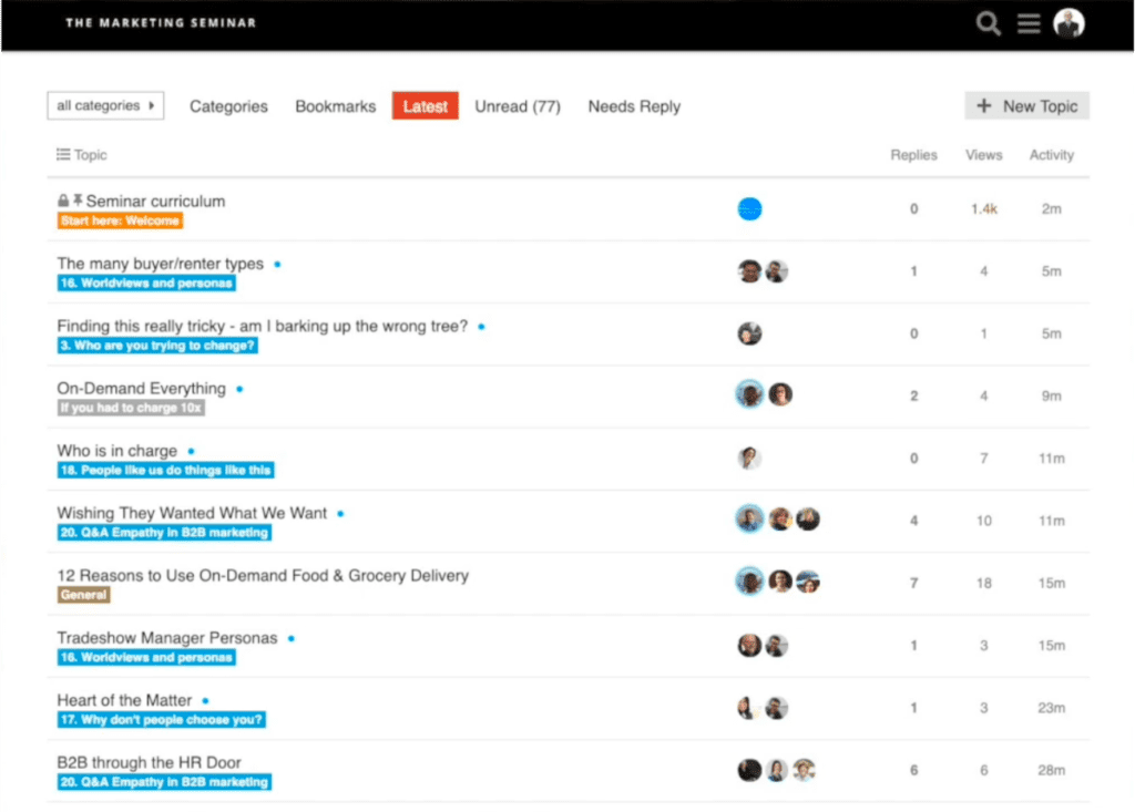 These discussion boards that you’re seeing (above) are the main thing in the community, and you’ve got Seth’s video content, but the real content is what the learners themselves are putting into it and how they’re interacting with each other and sharing stories. And Seth, because he’s Seth and he has a team of facilitators … I don’t even know if he pays them. They may be volunteers. I’m not sure, but they’re in there making sure that they’re doing what I was talking about earlier, highlighting relevant content on a user by user basis.
