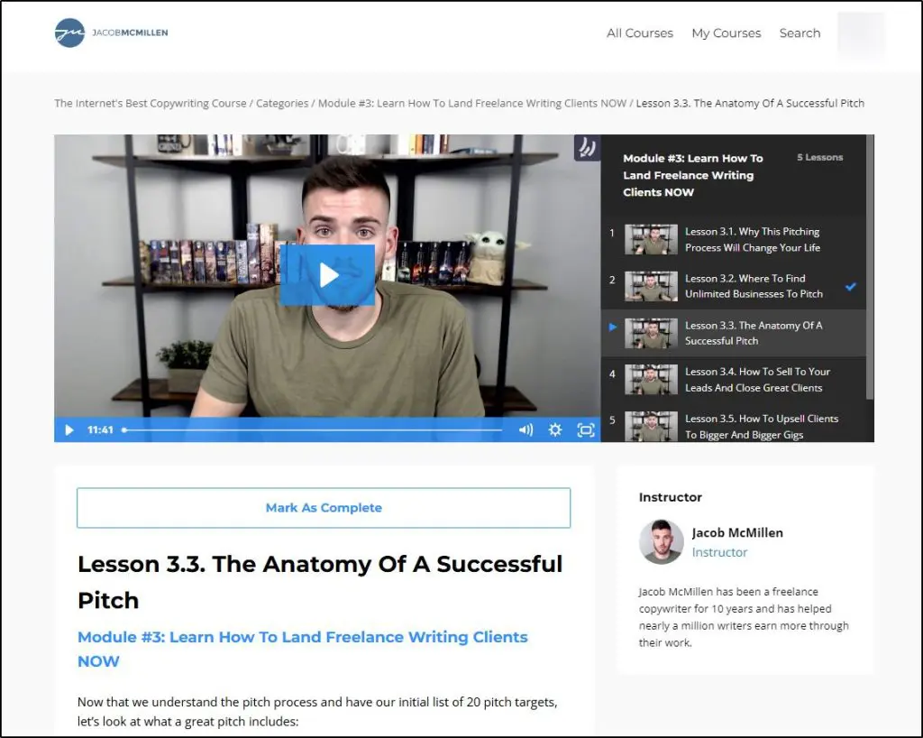 The lessons page of a copywriting course built with Kajabi