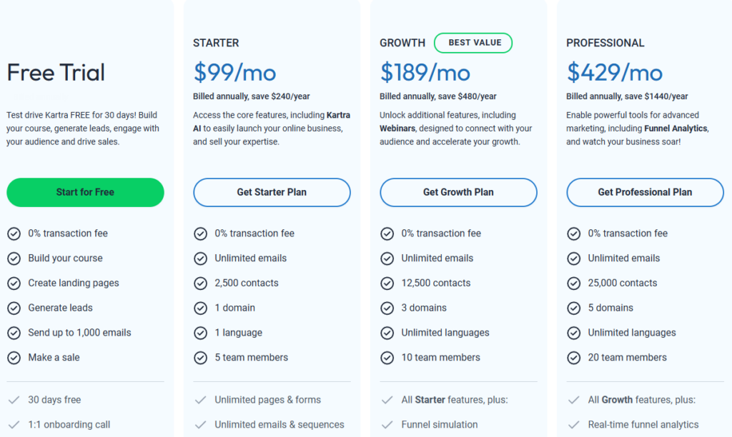 Kartra offers three different paid subscription plans that all come with a 30-day money-back guarantee and a 22% discount on annual billing.