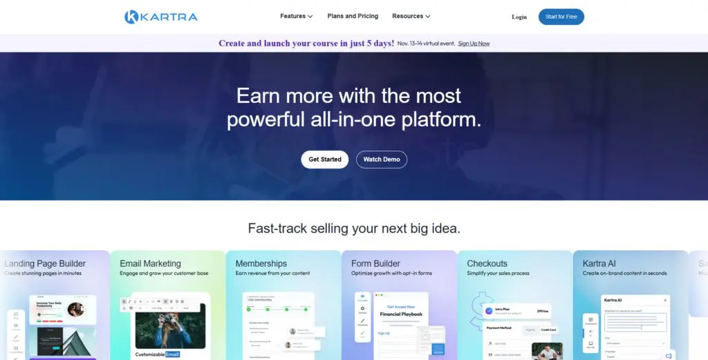 | Highly scalable course creation and marketing features | More expensive than Kartra |
