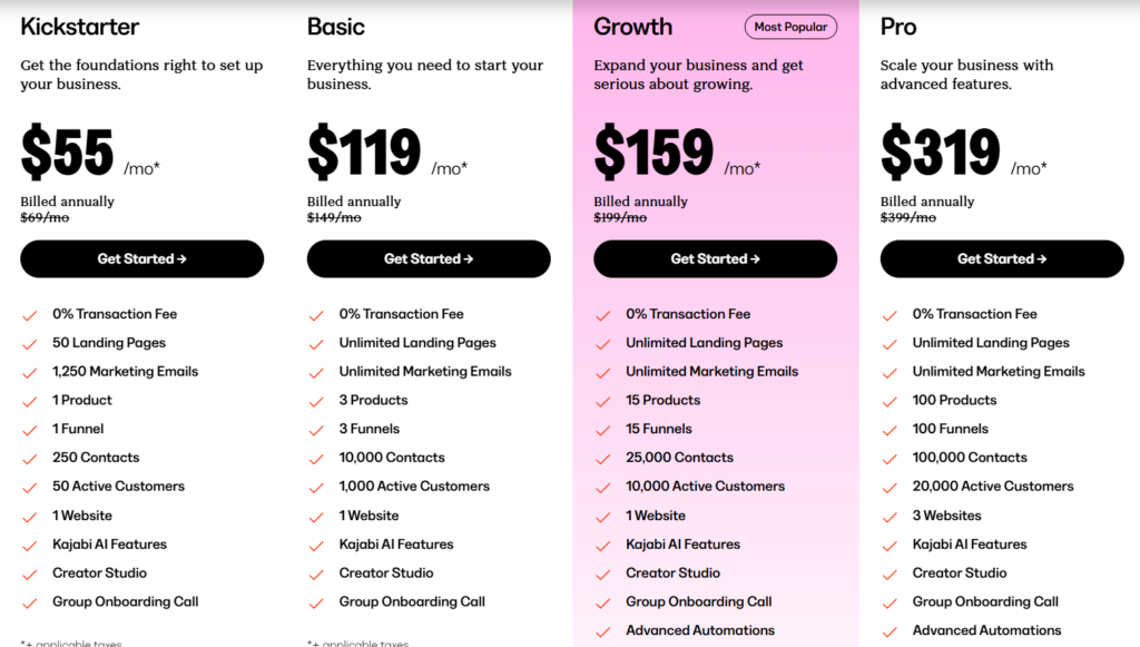 Their most popular plan, Growth, costs $159/month and offers 15 products, 15 sales funnels, unlimited landing pages, and unlimited marketing emails.