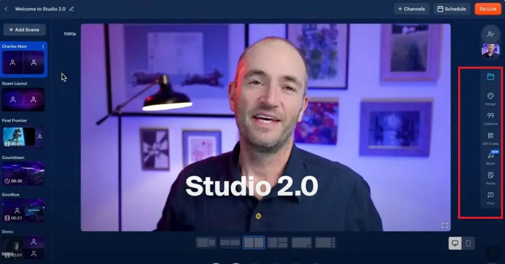 - Reusable studios, 1080p screen sharing, dark mode, and camera shape customization