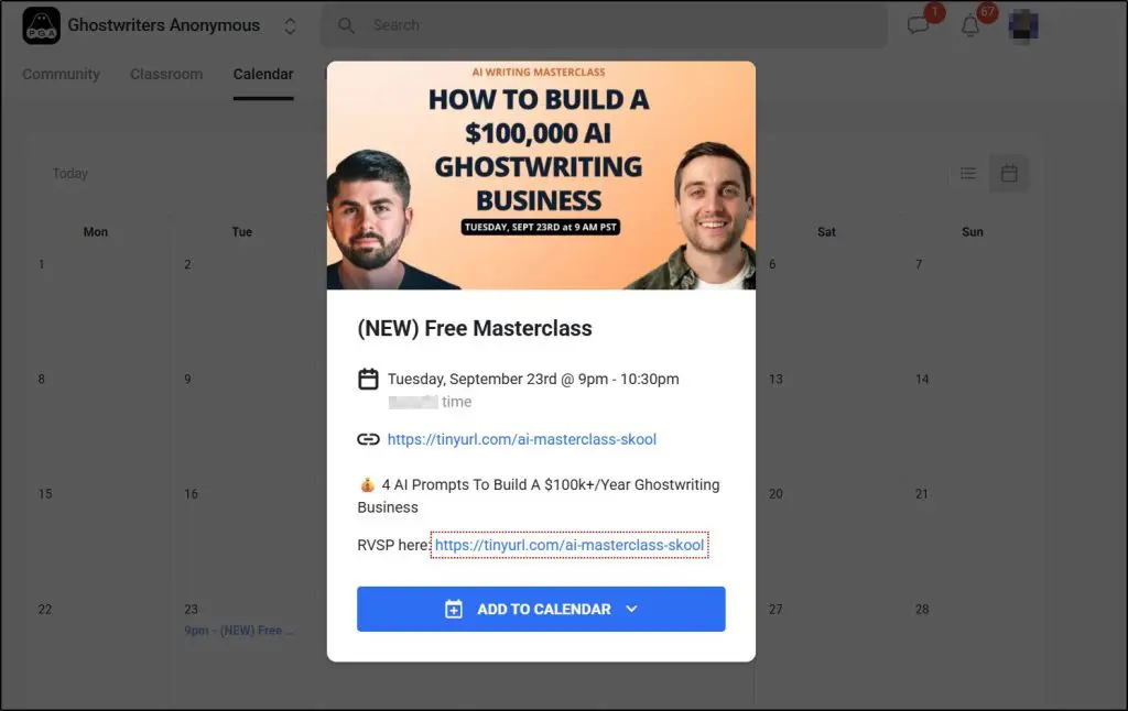 Members receive email reminders before the event starts, and the session also shows up in the community feed so people don’t miss it.