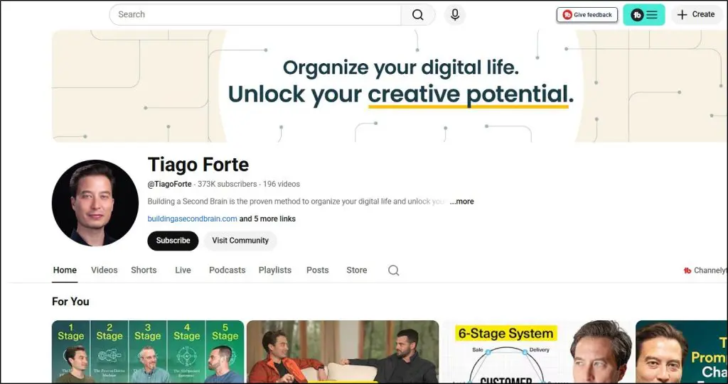 Tiago Forte, a productivity consultant, has an active YouTube channel with close to 400K thousand subscribers. He regularly publishes free content on various productivity-related topics and uses them to generate leads for his main course, “Building A Second Brain,” priced at $499.