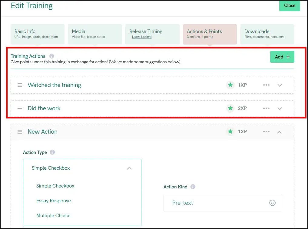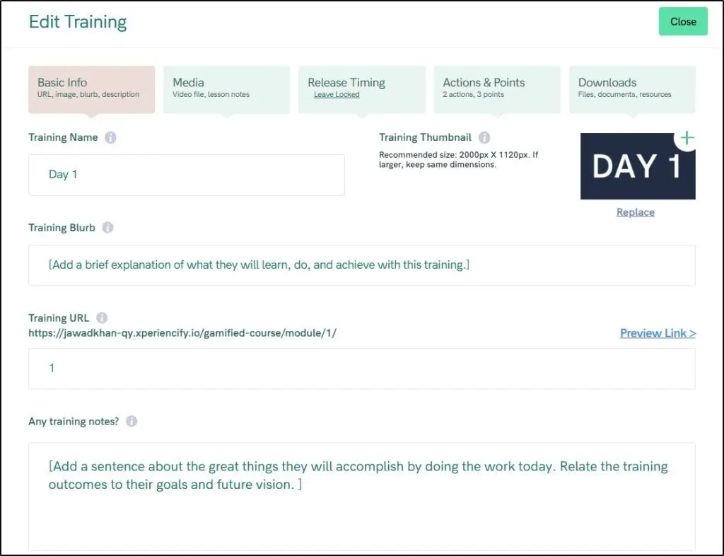 Each course is made up of Modules, and each Module has multiple Trainings (lessons). You can upload videos, add downloadable files, write lesson notes, insert checklists, and assign XP points. There’s support for content locking, drip schedules, and even binge mode—where finishing one lesson auto-unlocks the next.