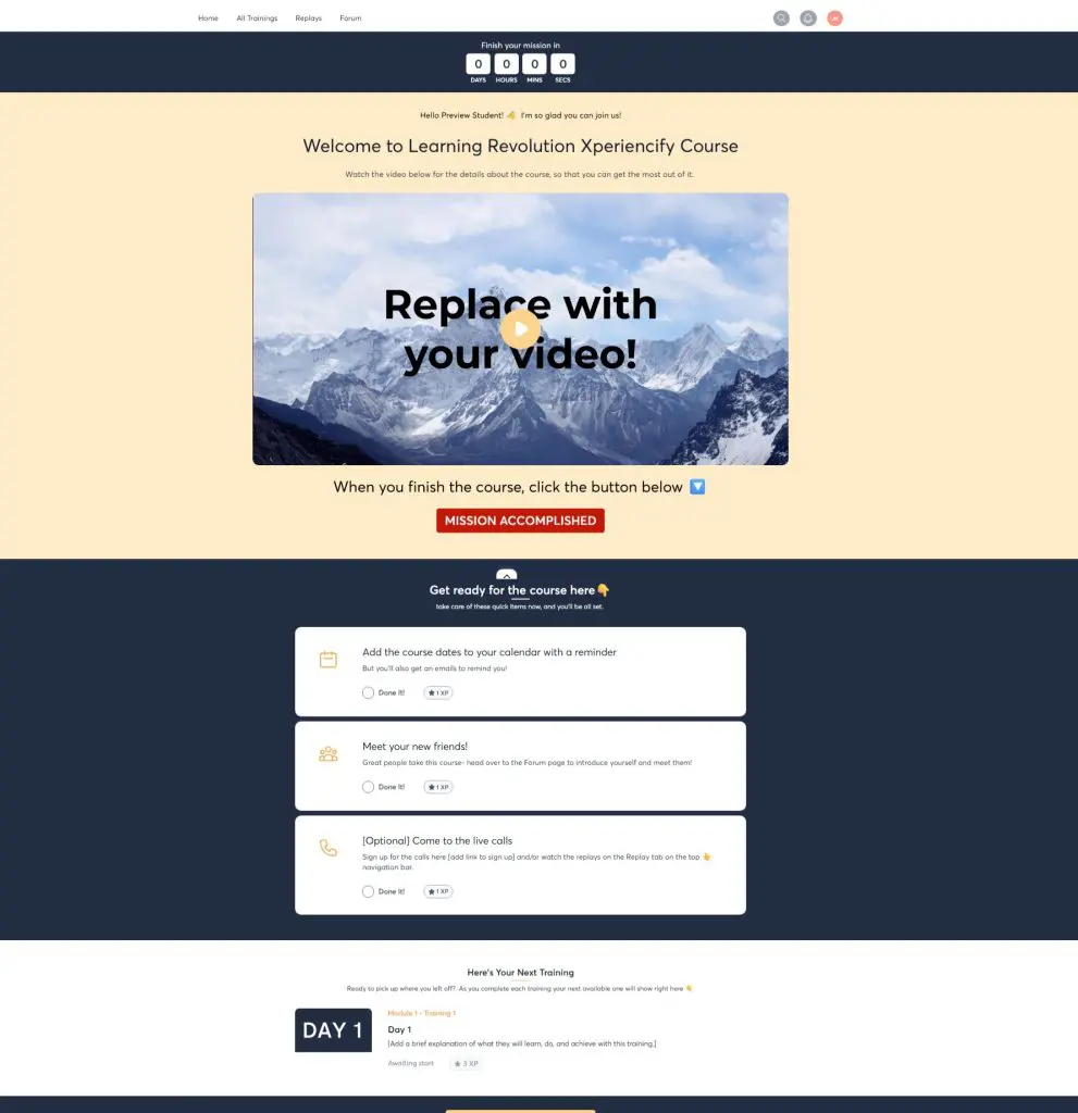 Xperiencify turns your course into an interactive, gamified experience that builds momentum and rewards action from the very beginning.